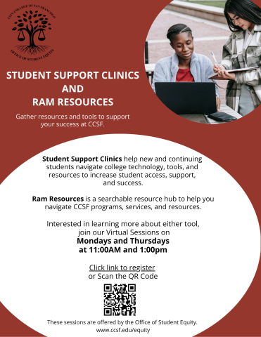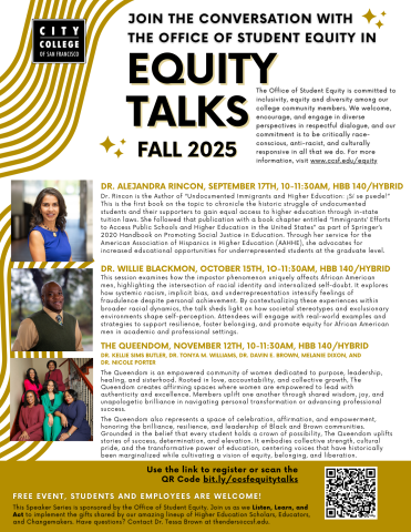 This series is offered by our very own internal experts who will share some equity minded practices, strategies, tools, and perspectives across various disciplines. Sessions will improve your ability to help students’ access resources and services to help increase their student success, retention and completion. Join us to learn, engage, and equip yourself with knowledge and awareness of the wide array of supports available at CCSF. All students, faculty and staff are welcome.