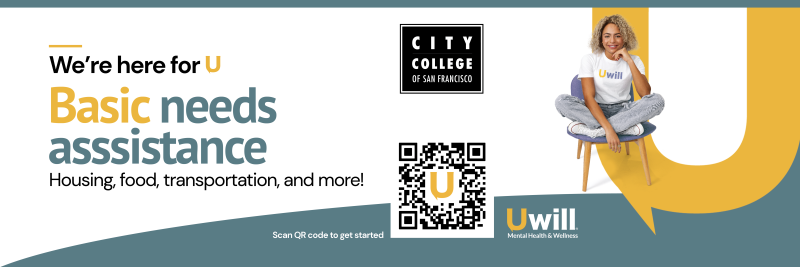 The Basic Needs Center have launched a new partnership with Uwill. We established this partnership to support CCSF students experiencing food and housing insecurities with afterhour, weekend, and holiday Basic Needs assistance as well as Mental Health & Wellness. Click the link or QR Code below or connect with a Basic Needs staff member in SSC 2106 to begin navigating the platform: