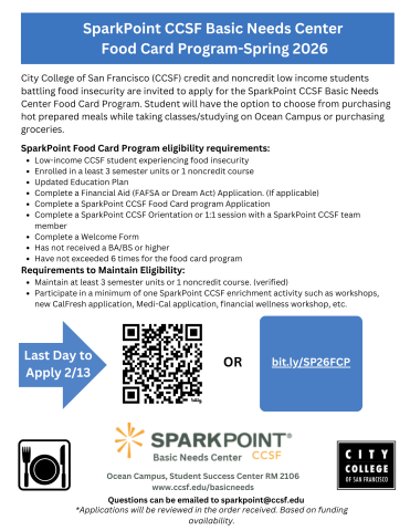 SparkPoint CCSF, Basic Needs Center Food Card Program application is available starting January 12th for spring 2026. Please see the flyer below, which outlines the criteria and details of how to apply.