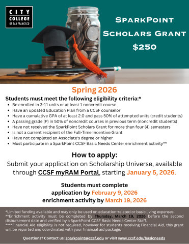 SparkPoint CCSF, Basic Needs Center is excited to launch our SparkPoint Scholars Grant in spring 2026. This $250 grant is intended to help students meet their basic needs while being a part-time college student attaining their educational goal of certificate or degree completion. The application opens January 5, 2026 in Scholarship Universe to part-time students who meet the eligibility criteria. Please see the flyer below, which outlines the criteria and how to apply.