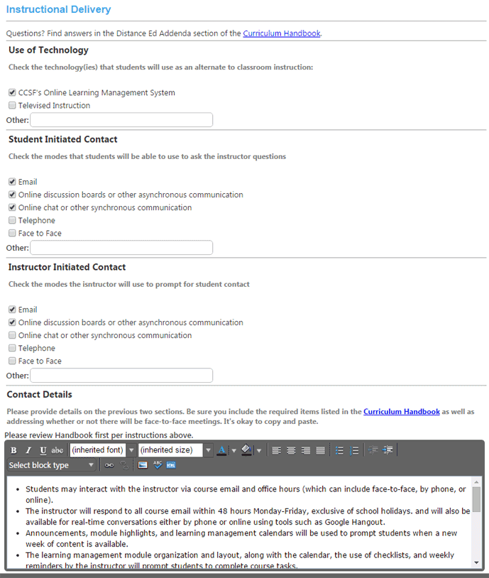 For more assistance, standards, and details on what to write, review the Curriculum Handbook sections for Distance Education Addenda -- Instructional Delivery.