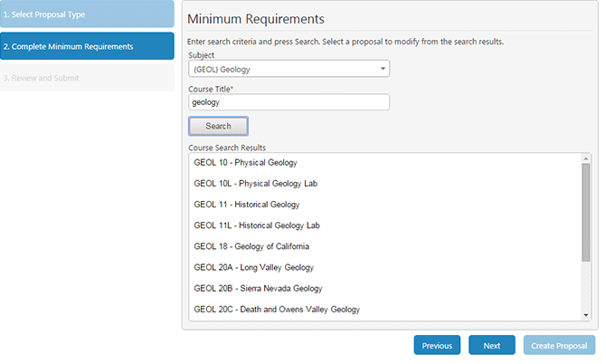 6. Scroll through the list of courses returned from your search. Once you find the course you want to modify, click it to choose it, and click Next to review your entry one more time before generating a draft proposal.